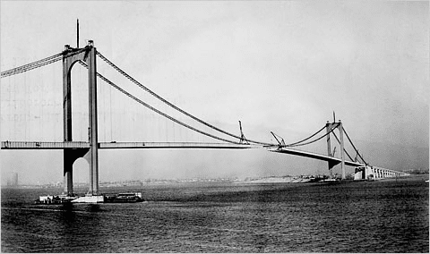 Сначала построили 2 стальные башни высотой 377 футов. Это длилось 18 дней. Быстро, верно? Далее протащили 2 троса, которые провисали и поддерживали главный пролет моста. Их длина 3965 футов. В мосту отсутствовали фермы жесткости, но применена система армирования балок из стальных пластин.
